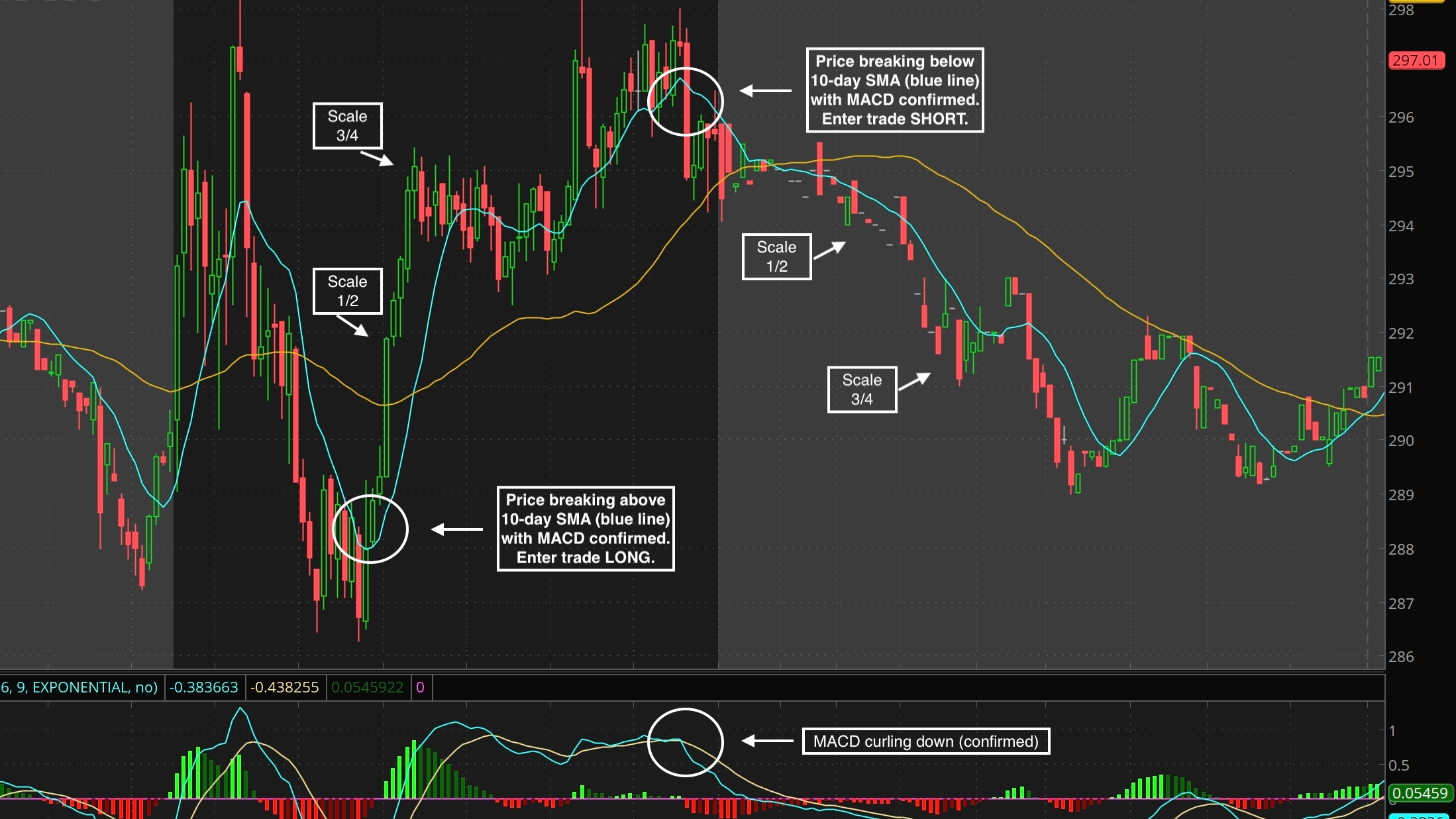 • Entra long o short quando il prezzo supera o scende sotto la SMA a 10 giorni, confermato da un incrocio MACD rialzista o ribassista.