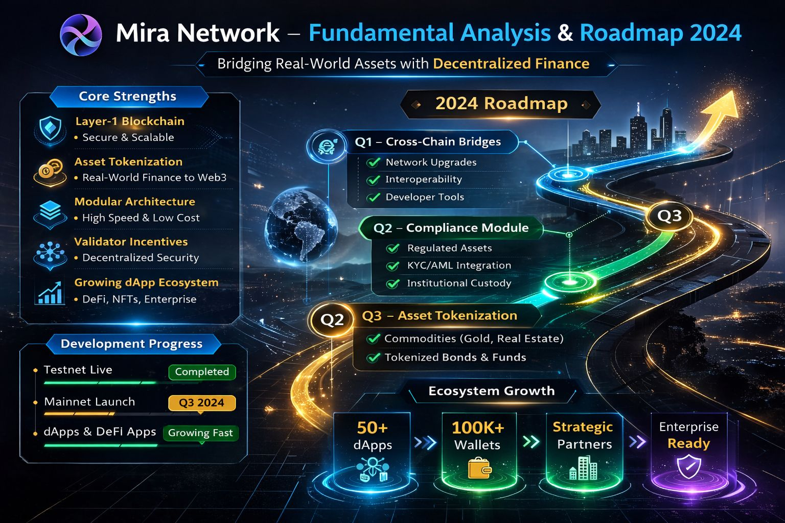 Mira Network has a structured roadmap for 2024, reflecting both short-term milestones and long-term strategic goals. In Q1, the focus will be on cross-chain bridges and network optimizations to enhance interoperability. Q2 aims to introduce advanced compliance tools to simplify the integration of regulated assets, including KYC/AML functionality. Q3 will see the tokenization of commodities and tokenized bonds, expanding Mira’s reach in real-world finance. Finally, Q4 focuses on enterprise partnerships and fintech integrations, creating a more comprehensive ecosystem and encouraging adoption by institutional players.