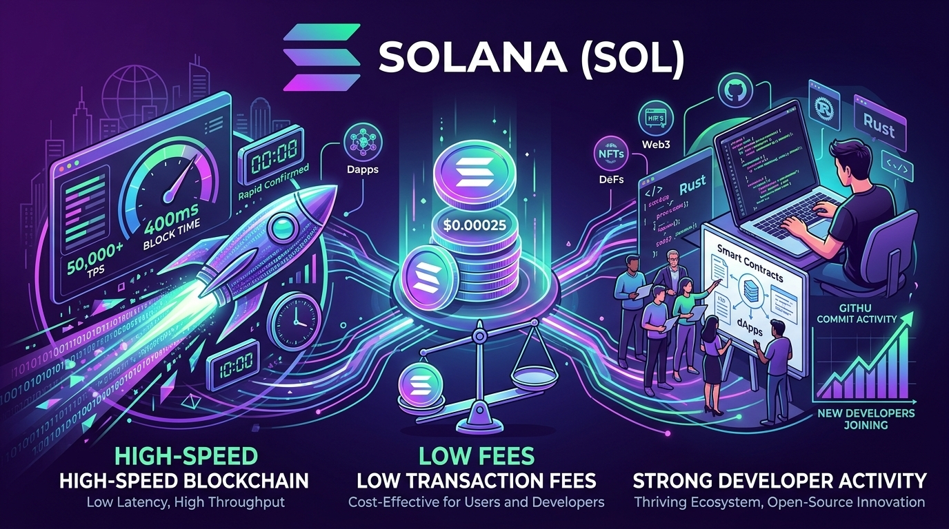 5. Solana (SOL) – High-speed blockchain known for low fees and strong developer activity.