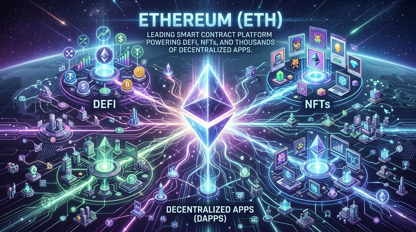 2. Ethereum (ETH)– Leading smart contract platform powering DeFi, NFTs, and thousands of decentralized apps.