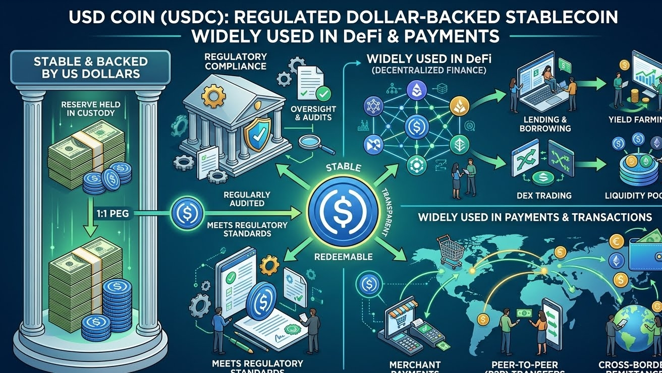 7. USD Coin (USDC)– Regulated dollar-backed stablecoin widely used in DeFi and payments.