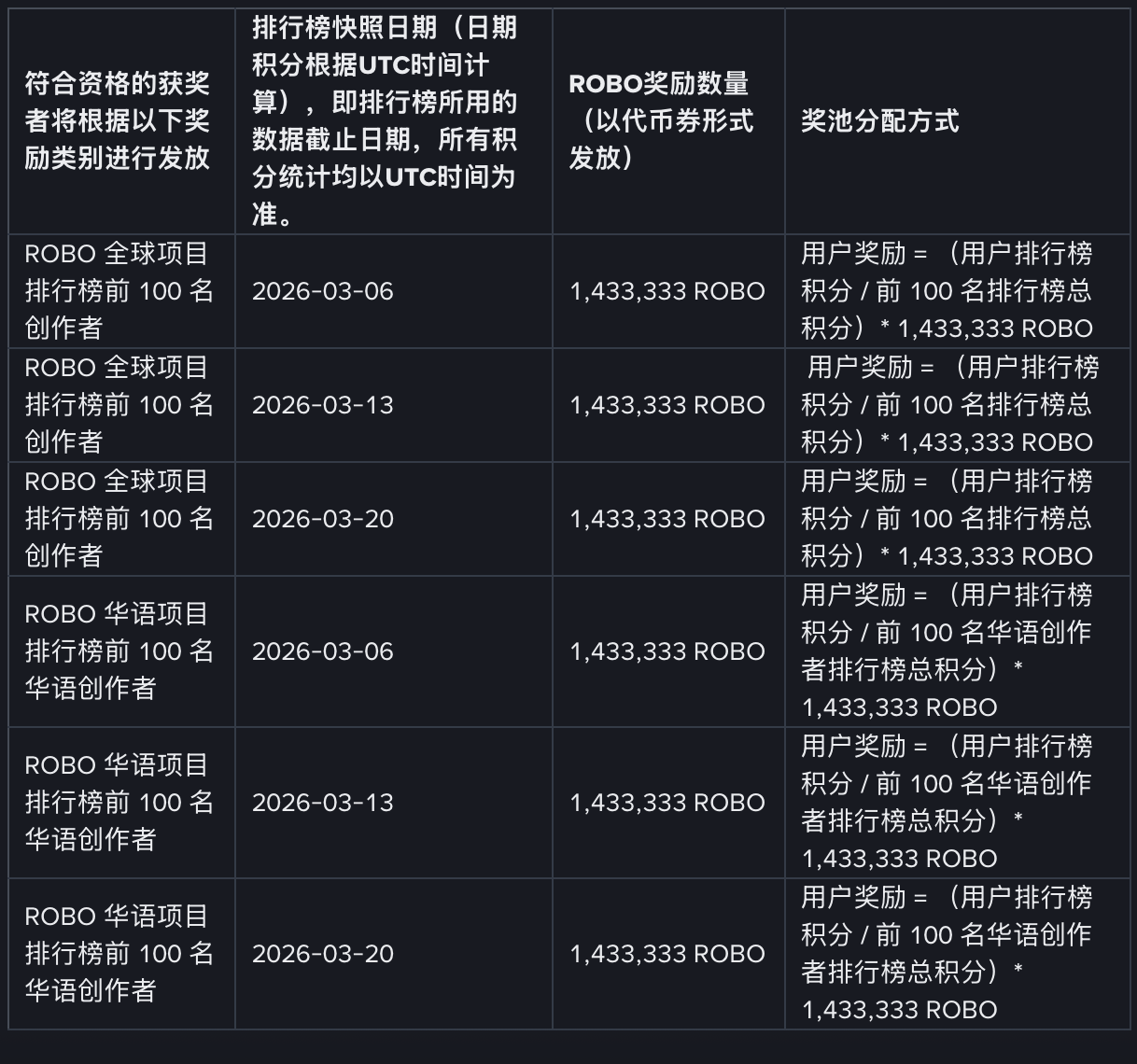 昨天下午4点空投888个ROBO后,创作者任务台马上出现奖池总额为860万枚ROBO的任务,奖励分三个阶段快照,每次1433333枚按积分占比分给前100名,1%的概率按现价0.038U来算一次能拿544刀,三次都拿共计1634刀。这波福利的豪气程度,直接盖过了ROBO本身破发的尴尬。