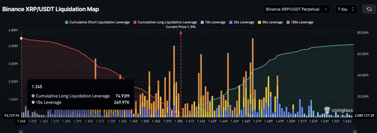 Высокая волатильность в криптовалютах часто усиливается из-за избытка маржинальных позиций. В отличие от ситуации с Ethereum, где наблюдается явный перекос в сторону длинных позиций, рынок XRP выглядит гораздо более здоровым. На крупнейших биржах объем длинных и коротких позиций практически равен: около $74,93 млн против $69,14 млн.
