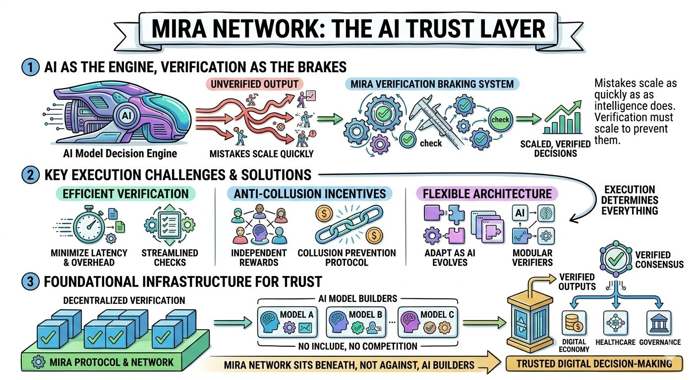 Mira is not trying to compete with AI model builders. It is positioning itself as the trust layer that can sit beneath them. If AI becomes the engine of digital decision-making, verification becomes the braking system. Without it, mistakes scale as quickly as intelligence does.