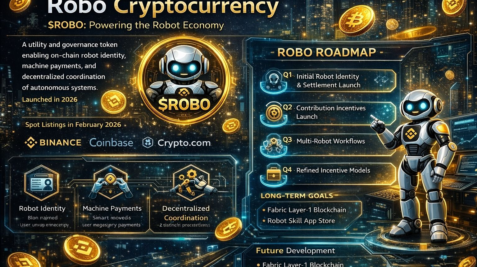 Robo’s roadmap is structured into phased deployments throughout 2026: initial robot identity systems and task settlement launch in Q1; contribution-based incentive mechanisms in Q2; multi-robot workflow support in Q3; and refined incentive models in Q4. Long-term plans include a dedicated Fabric Layer-1 blockchain tailored for machine economy use and a Robot Skill App Store to foster developer engagement. �