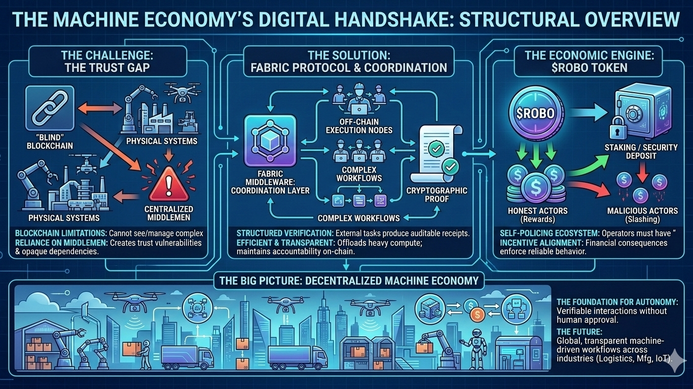 $ROBO e il Fabric Protocol risolvono questo costruendo un ponte trasparente tra i due. Fabric funge da livello di coordinamento sofisticato—un supervisore digitale che gestisce il lavoro pesante "off-chain" senza intasare la rete principale. Invece di costringere la blockchain a fare tutti i calcoli, Fabric assegna compiti a una rete distribuita di nodi che svolgono il lavoro esternamente e poi inviano una "ricevuta" crittografica di nuovo alla catena. Questo garantisce che il lavoro sia stato svolto onestamente e con precisione senza necessitare di un capo centrale.