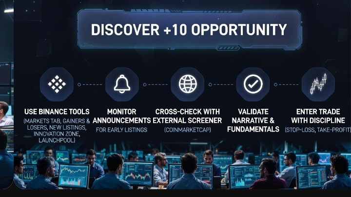 Scoprire opportunità x10+ su Binance è un'abilità, non fortuna — e oltre il 90% dei token a bassa capitalizzazione fallisce ancora o va a zero. Questo NON è un consiglio finanziario. Tratta ogni potenziale gemma come una speculazione ad alto rischio. Usa solo il denaro che puoi permetterti di perdere, non rischiare mai più dell'1% del tuo capitale per operazione, e usa sempre stop-loss + take-profit. Segui esattamente i passaggi di gestione del rischio e istruzione che abbiamo trattato in precedenza (prima l'Accademia Binance!). Ecco il processo provato e ripetibile che i principianti usano nel 2026 per cercare monete x10+ direttamente su Binance (aggiornato dagli attuali strumenti e guide di Binance):