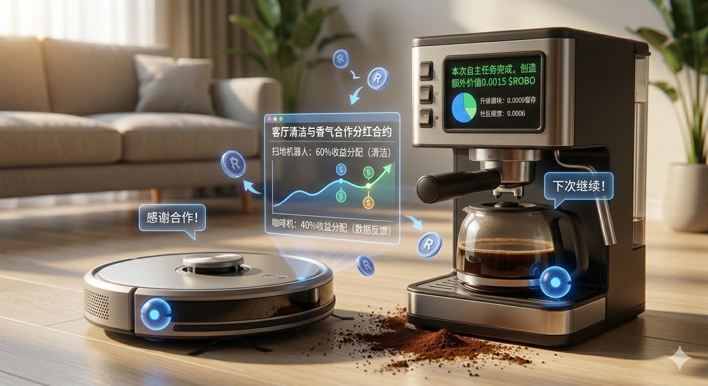 任务结束后,它们用链上合约自动分账——扫地机器人因为清理功劳大拿60%,咖啡机因为数据反馈拿40%。扫地机器人还主动留言:“感谢合作,下次我多清理厨房区,你多给我点香气数据,我们一起赚更多!”