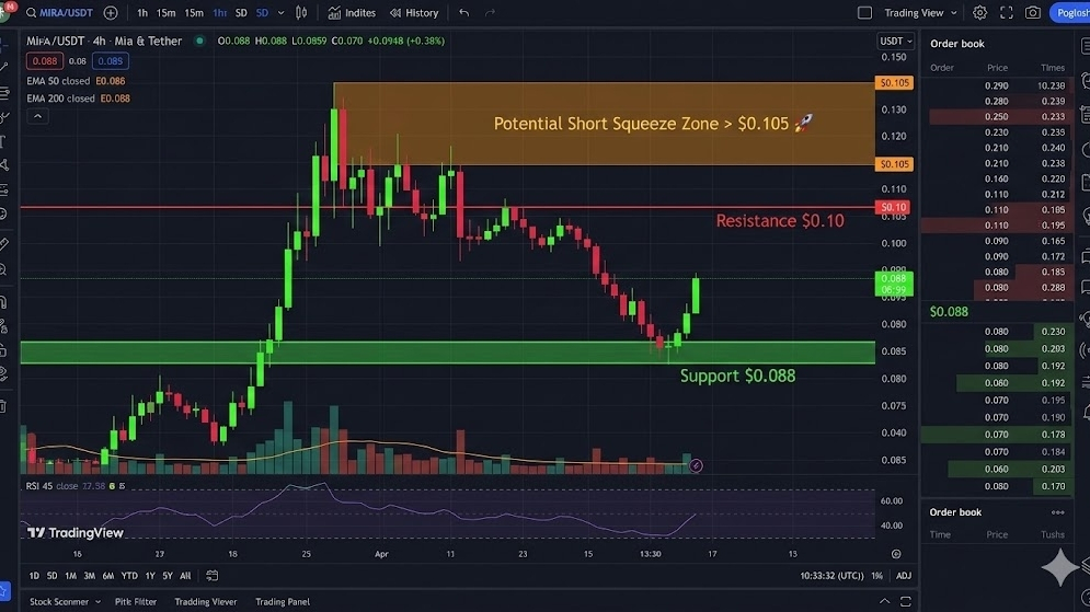 MIRA è a un crocevia critico. Mentre il sentiment del mercato più ampio rimane influente, gli indicatori tecnici per MIRA stanno iniziando a mostrare promesse rialziste. I trader monitoreranno da vicino il livello di resistenza a $0.10 e la zona di supporto a $0.088 per confermare il prossimo grande movimento. Una rottura sopra $0.10, specialmente con conferma da altri indicatori e volume aumentato, sarebbe un forte segnale rialzista.