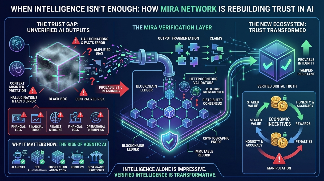 Artificial intelligence has become part of our everyday digital experience. It writes, analyzes, predicts, designs, and even makes decisions that once required human judgment. Yet beneath the impressive capabilities lies a growing concern: AI can sound confident while being completely wrong. It can hallucinate facts, amplify bias, or misinterpret context, and it often does so in ways that are difficult to detect. As AI begins to power financial systems, medical tools, autonomous agents, and robotics, the cost of error is no longer small. The world is discovering that intelligence without verification is not enough. This is the space where Mira Network steps in.
