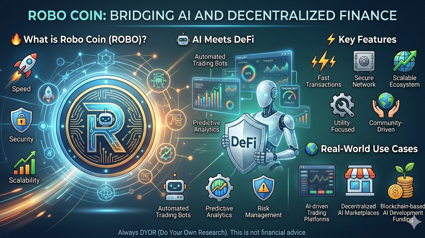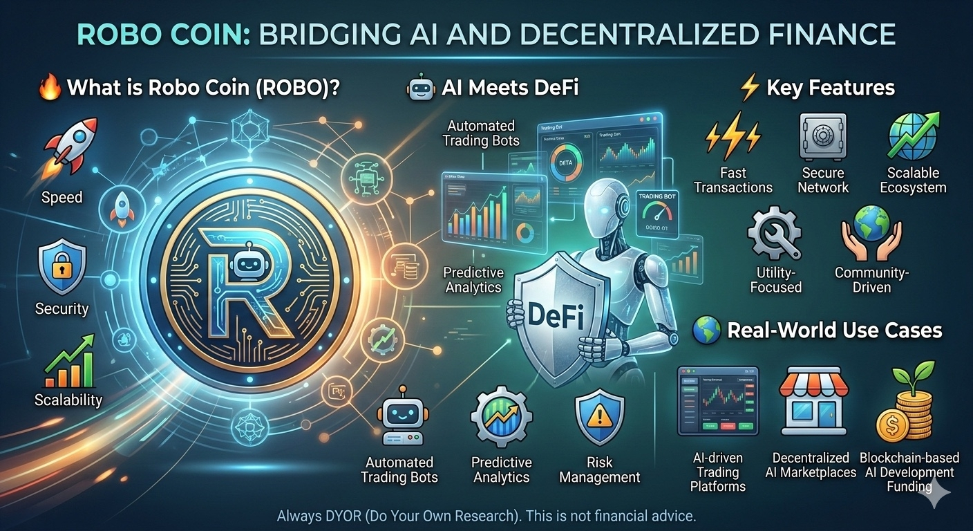 In today’s rapidly evolving digital economy, innovation is the key to success. Robo Coin (ROBO) is a next-generation cryptocurrency designed to bridge the gap between Artificial Intelligence (AI) and Decentralized Finance (DeFi). By combining the power of intelligent automation with blockchain transparency, ROBO aims to revolutionize how users interact with financial systems in the digital age.