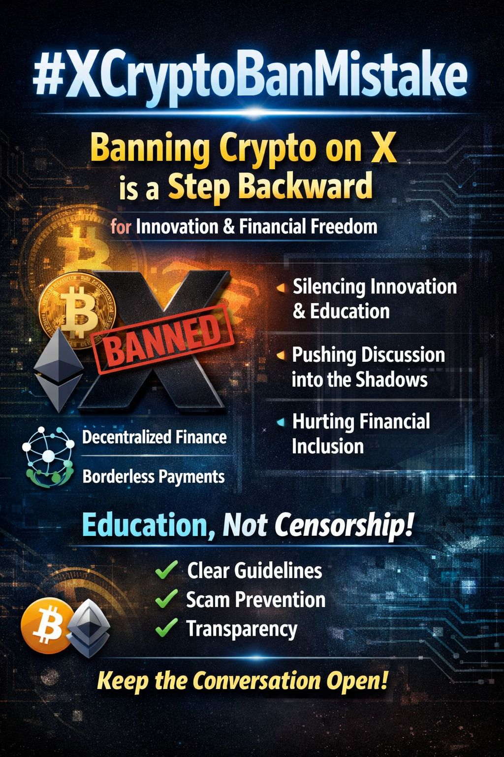 #XCryptoBanMistake Vietare le criptovalute su X sarebbe un enorme passo indietro per l'innovazione, la libertà finanziaria e la conversazione aperta. Le criptovalute non sono solo speculazione, rappresentano un cambiamento verso la finanza decentralizzata, i pagamenti senza confini e gli asset controllati dagli utenti. Silenziare quella discussione sotto #XCryptoBanMistake danneggerebbe costruttori, investitori, educatori e utenti quotidiani che fanno affidamento su informazioni trasparenti.