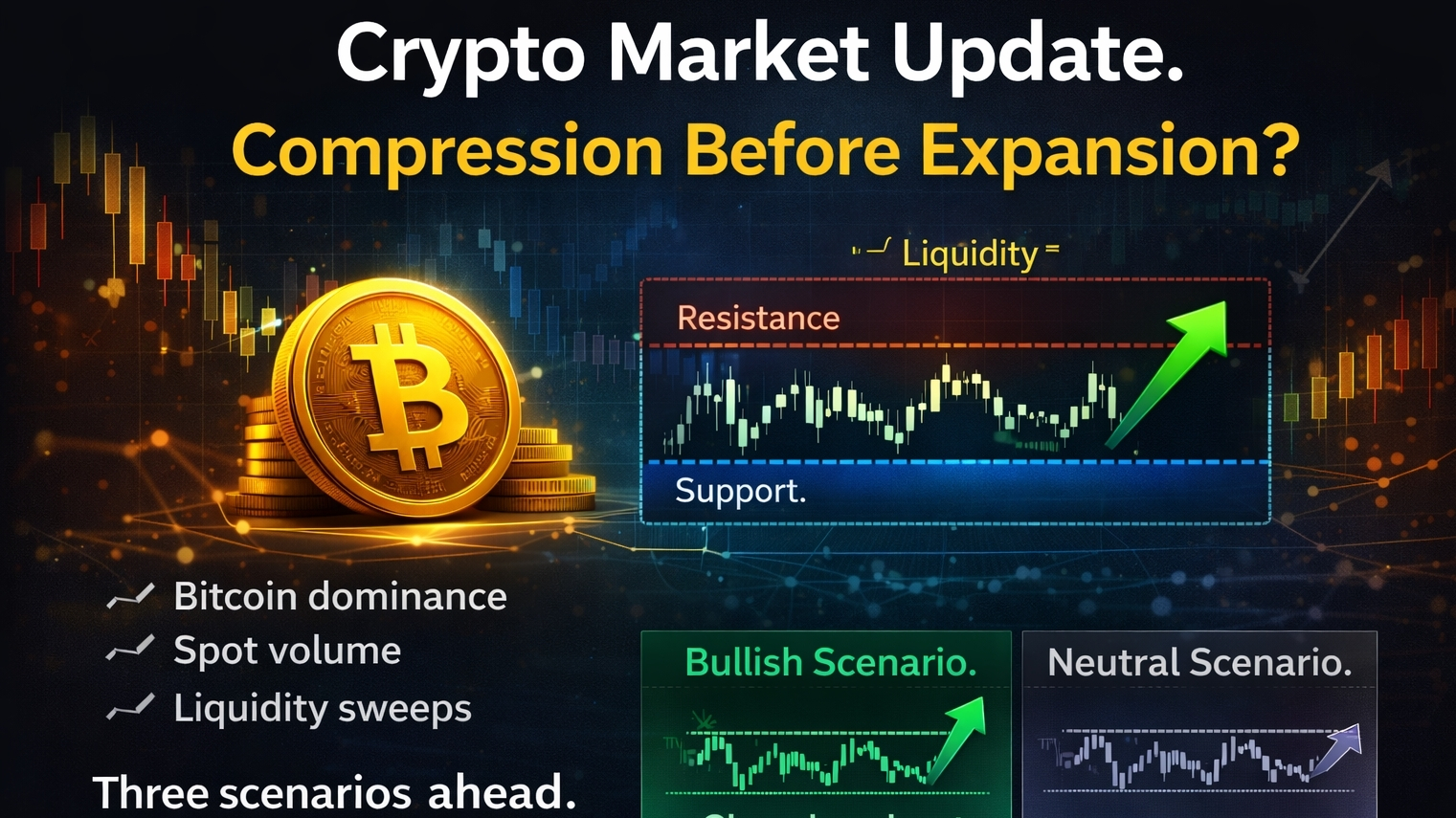 When BTC trades in a narrow band, liquidity builds above resistance and below support.