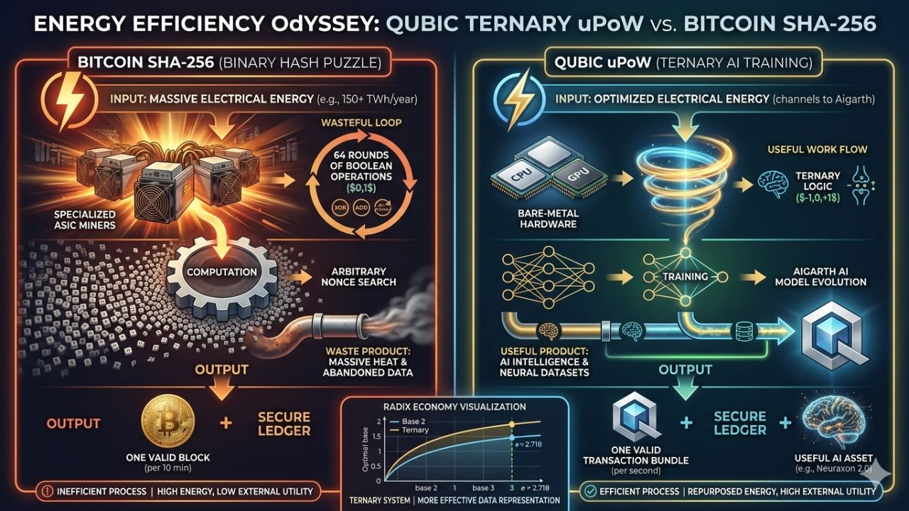 Perché 3 è più vicino a 2.718 di quanto non lo sia 2, i sistemi ternari sono teoricamente il 15% più efficienti nell'elaborazione delle informazioni. Qubic fa di più con meno energia—un fattore critico per l'addestramento dell'IA su scala globale.