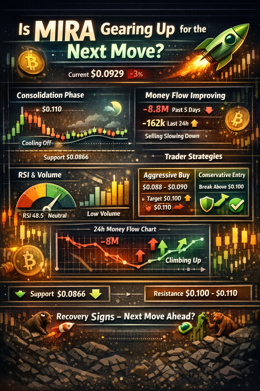 MIRA had a strong spike before touching almost $0.1100 🚀 That was a powerful impulse move. After that, price pulled back and now moving sideways around $0.09 area.