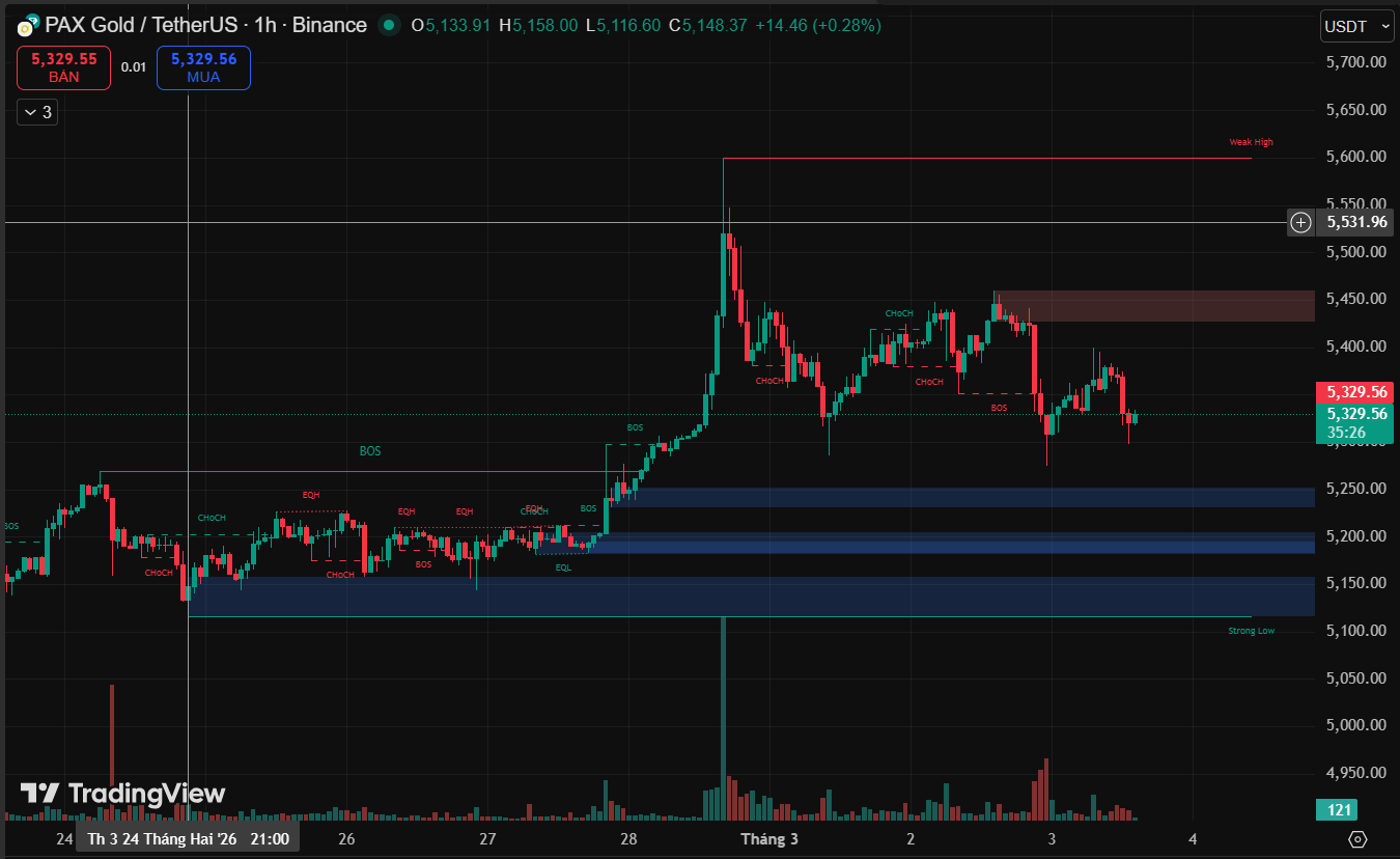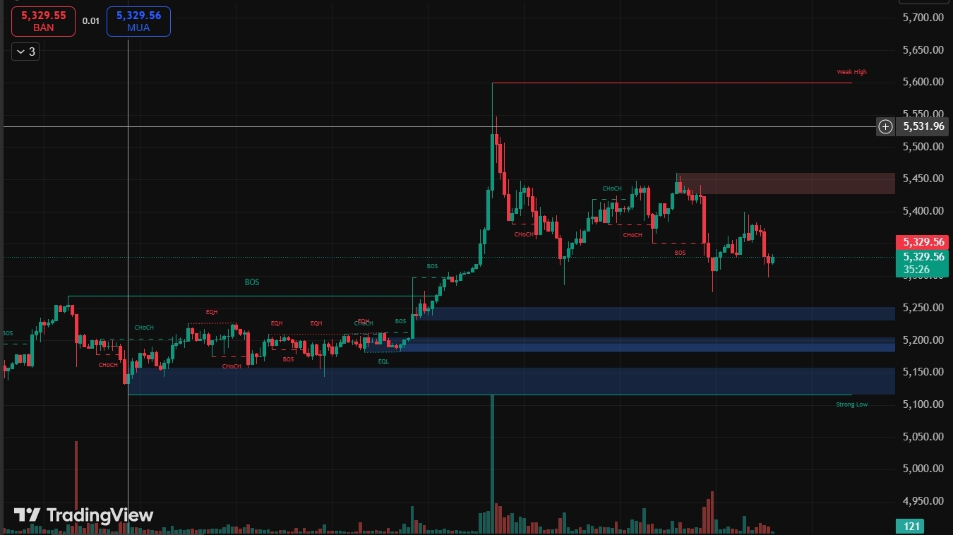 Dopo aver raggiunto un massimo di ~5,600 → il prezzo è sceso e ha formato un BOS ribassista su H1.