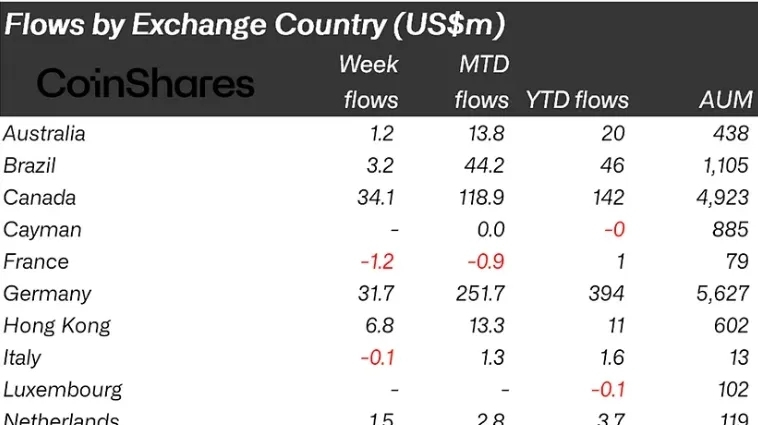 La maggior parte degli investimenti proviene dagli Stati Uniti — $957 milioni. I prodotti quotati in Canada, Germania e Svizzera hanno attratto rispettivamente $34,1 milioni, $31,7 milioni e $28,4 milioni.