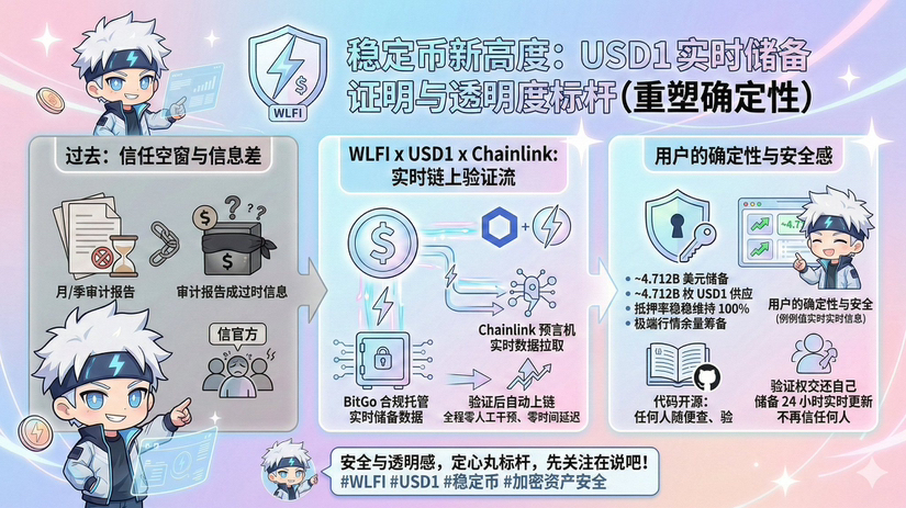Ora USD1 collabora con Chainlink, estraendo in tempo reale i dati di riserva da BitGo, un'agenzia di custodia conforme, e caricandoli automaticamente sulla blockchain dopo la verifica, senza intervento umano e senza ritardi, con lo stato delle riserve aggiornato in tempo reale 24 ore su 24, 7 giorni su 7, accessibile in qualsiasi momento e luogo.