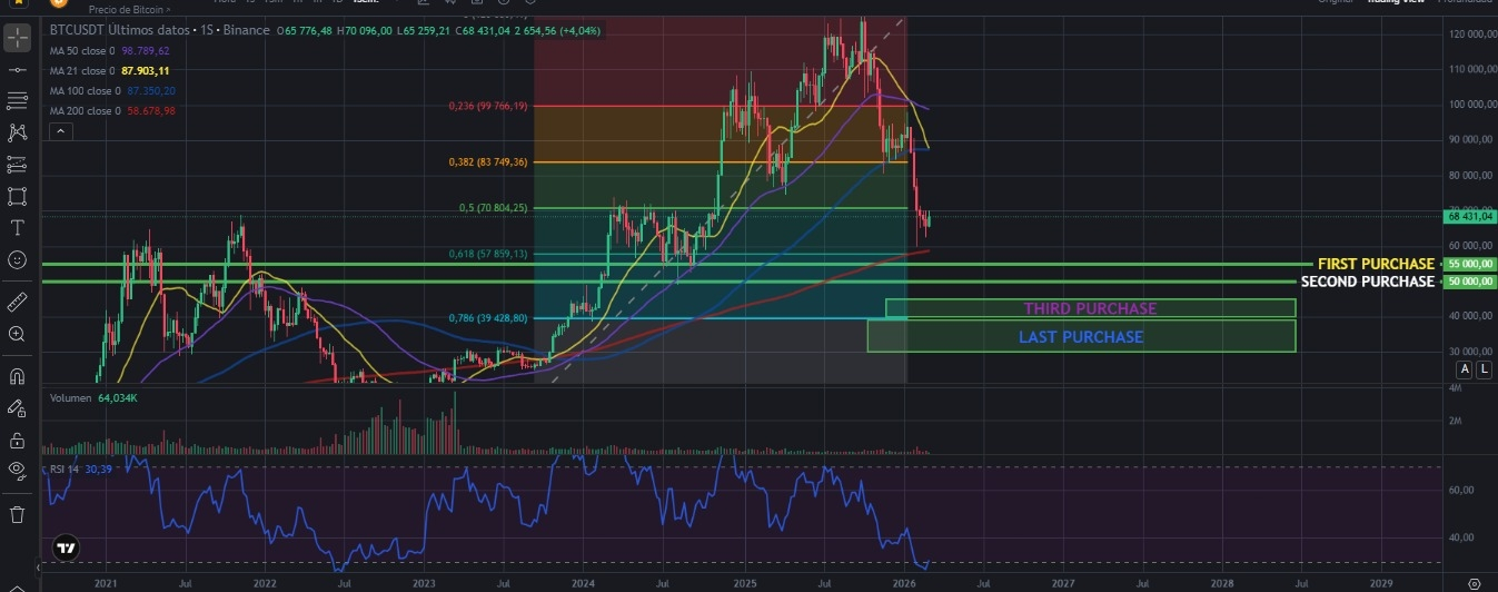 Ahora como resultado de mi análisis técnico para BTC mi plan es ir realizando compras de la siguiente manera: