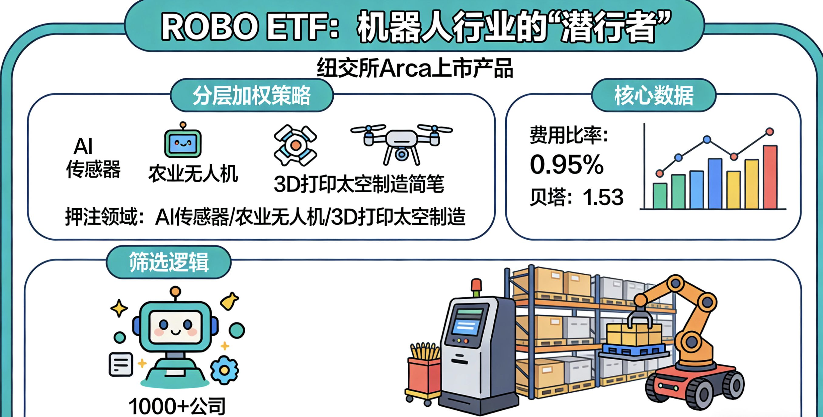 Per prima cosa, parliamo dell'ETF ROBO, questo prodotto quotato all'Arca della Borsa di New York che sembra riservato 😊😊😊 in effetti è il "sottovalutato" dell'industria dei robot. Non si limita a tracciare un indice, ma attraverso una strategia di ponderazione stratificata, scommette silenziosamente su sotto-settori trascurati dal mainstream - come l'applicazione dei sensori AI nei droni agricoli o le innovazioni della stampa 3D nella produzione spaziale. La commissione è dello 0.95%, beta 1.53, il che significa che è stimolante come un'ottovolante, ma inietta vitalità nelle azioni globali a piccola e media capitalizzazione. Diversamente dagli ETF tecnologici generali, la logica di selezione di ROBO deriva da un'analisi qualitativa approfondita di oltre 1,000 aziende: non cerca i giganti popolari, ma predilige i "campioni invisibili", come le startup focalizzate su bracci robotici flessibili. Queste aziende sono forti nel sopportare i cicli economici, poiché l'automazione non è un lusso, ma una necessità - pensa a come i robot per la logistica dopo la pandemia abbiano salvato la catena di approvvigionamento. 😍😍😍😍😍