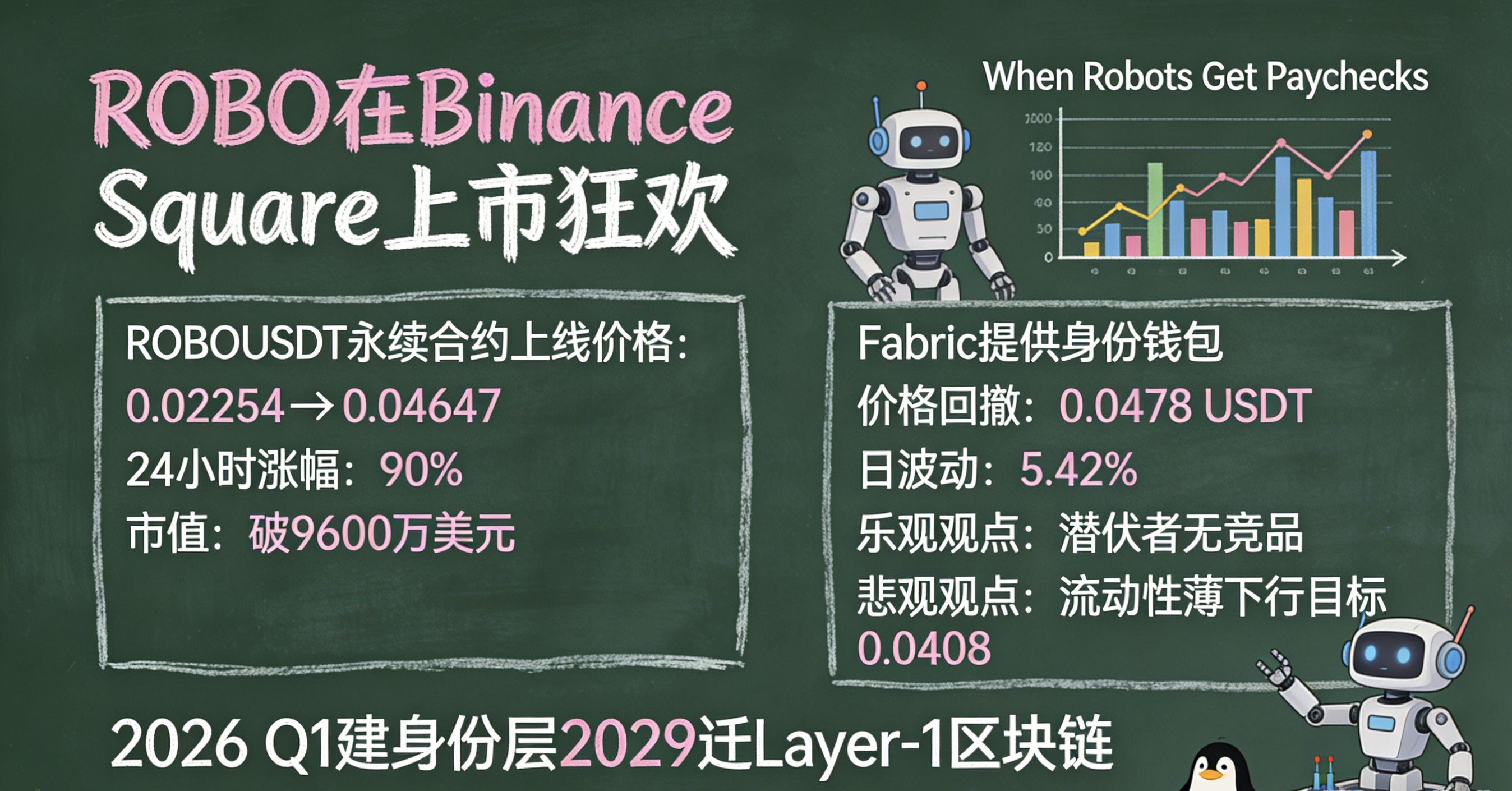 La festa del listing di ROBO è in pieno svolgimento su Binance Square: il contratto perpetuo ROBOUSDT è salito da 0.02254 a 0.04647, con un aumento del 90% in 24 ore, e la capitalizzazione di mercato ha superato i 96 milioni di dollari. I post della comunità come "Quando i robot ricevono gli stipendi" descrivono il futuro: i robot scambiano dati come gli esseri umani, Fabric fornisce portafogli d'identità, evitando trappole centralizzate. Ma il mercato non è tutto rose e fiori: le liquidazioni long sono frequenti, il prezzo è tornato a 0.0478 USDT, con una volatilità giornaliera del 5.42%. Gli ottimisti lo vedono come un "sottovalutato", senza concorrenti diretti, con grande potenziale di squeeze; i pessimisti avvertono della liquidità scarsa 😭😭😭 obiettivo di discesa 0.0408. Unico è che la sua tabella di marcia non è vuota: nel Q1 2026 costruzione del layer di identità, nel 2029 migrazione alla blockchain Layer-1, enfatizzando l'adozione reale - come i robot UBTech che eseguono compiti in modo indipendente 👍👍👍👍