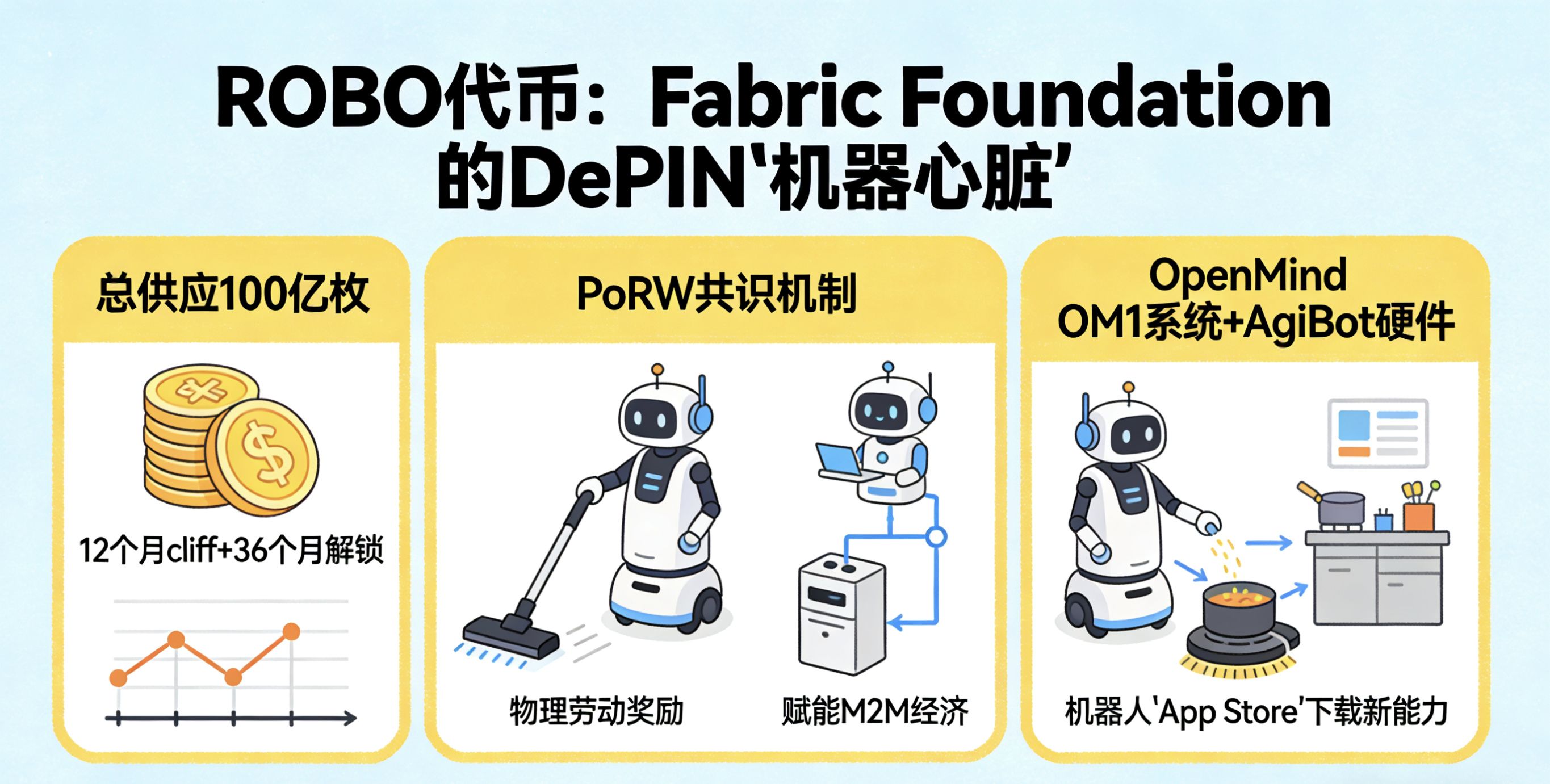 Passando al lato crittografico, il token ROBO è come un "cuore meccanico", pompando il sangue DePIN della Fabric Foundation. Fornitura totale di 10 miliardi di unità, un cliff di 12 mesi e 36 mesi di sblocco, non è per la speculazione, ma per costruire solide fondamenta 🤟🤟🤟 il suo meccanismo di consenso PoRW (Proof of Robotic Work) sovverte il mining tradizionale: le ricompense non sono basate sulla potenza di calcolo, ma sulla verifica del lavoro fisico - ad esempio, un robot per la pulizia "dimostra" quanto polvere ha aspirato per guadagnare token. Questo consente a ROBO di abilitare il M2M (machine-to-machine) in tutto, dal pagamento delle spese di ricarica al voto di governance. Partner come il sistema OM1 di OpenMind, integrato con l'hardware di AgiBot, creano un "App Store" per robot - moduli di abilità, i robot possono "scaricare" nuove capacità, ad esempio passando dalla pulizia alla cucina.