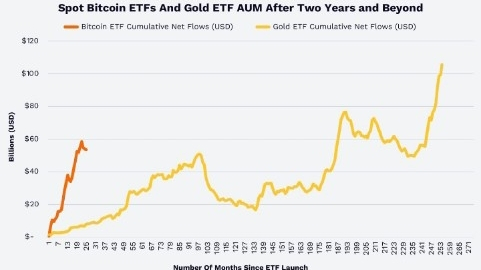 Gli ETF su Bitcoin hanno eguagliato i flussi cumulativi di 15 anni degli ETF sull'oro in meno di 2 anni, rendendolo uno dei flussi di capitale più rapidi mai visti nella storia degli ETF