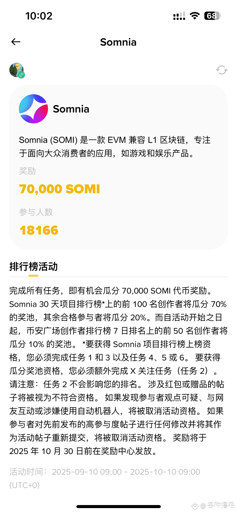 📣 零门槛撸Somnia羊毛啦!只需0.3刀成本,简单任务做完坐等分币! 🎯 奖池超丰厚:70,000 $SOMI 等您拿~ 🌟 排行榜前100分70%,其他合规再分20% 🚀 币安广场TOP 50大佬再加分10%! ❗ 必做任务1、3 + 4/5/6任一,X关注(任务2)必须完成! 🕒 奖励10月30日前发,不冲后悔~ @Somnia Official #Somnia $SOMI