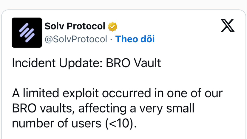 La piattaforma DeFi incentrata su Bitcoin Solv Protocol ha dichiarato che uno dei loro vault token BRO ha subito un "attacco limitato", che si presume abbia colpito meno di 10 utenti.