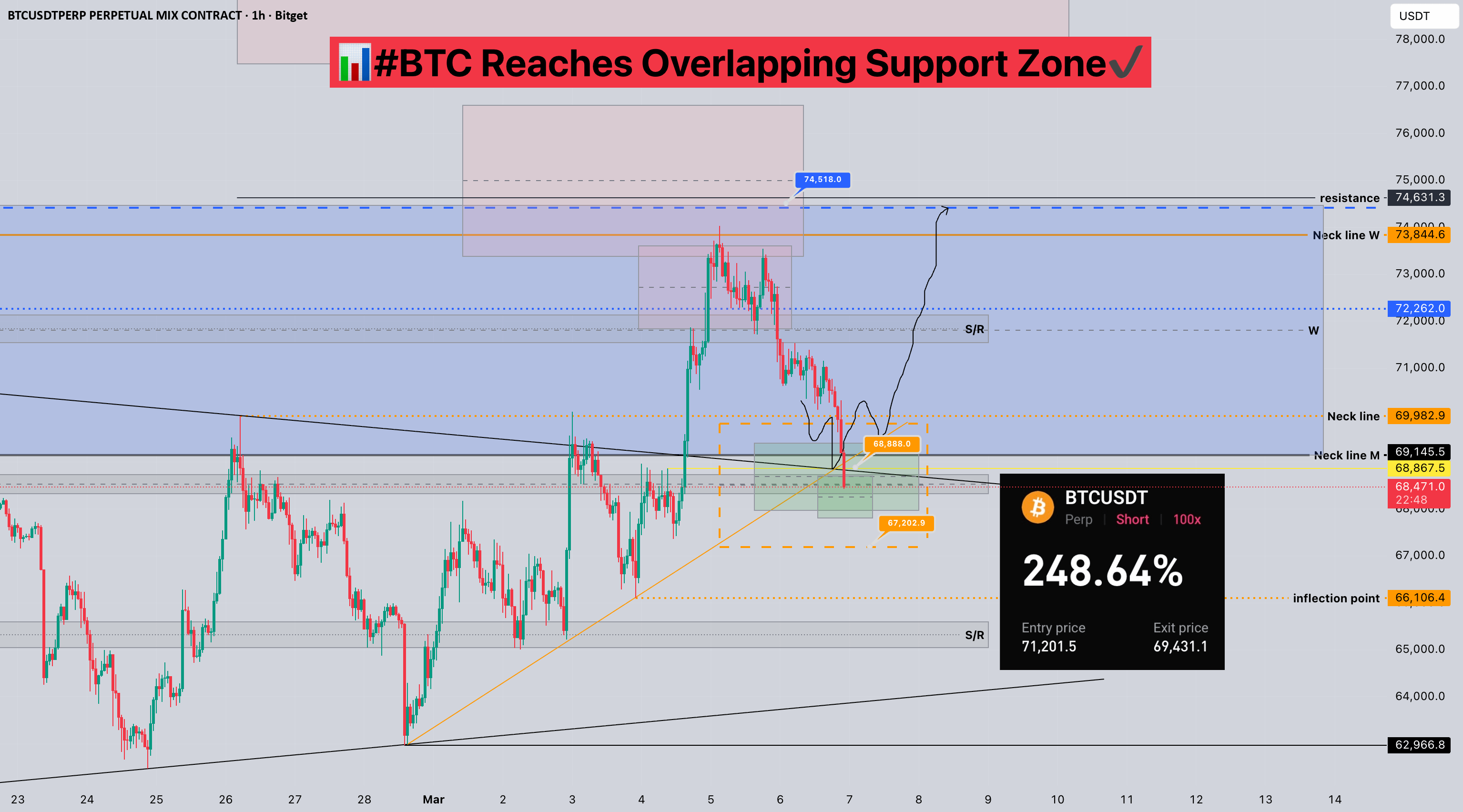 ➡️Dal punto di vista strutturale, il livello 68000 è stato un livello di resistenza testato più volte in precedenza, e dopo una rottura riuscita, ora è diventato un livello di supporto. Questa è anche l'area target per la struttura ribassista. Se possiamo mantenere questo livello, c'è ancora speranza di ottenere ulteriori guadagni. Tuttavia, ricorda che questo è un mercato ribassista; la tendenza principale rimane ribassista, quindi non essere troppo avido!