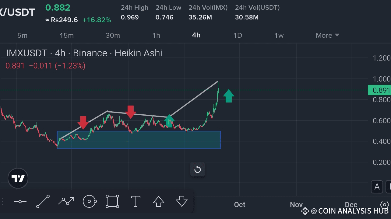 Al momento, IMX sta scambiando intorno a 0.88 – 0.89 USDT, dopo un forte e sano breakout dalla zona di accumulo 📈. Il mercato era stato consolidato all'interno di una scatola blu (zona di domanda/sostegno) per un bel po' di tempo. Questa lunga fase laterale ha agito come un periodo di costruzione della base, dove il denaro intelligente si accumulava silenziosamente prima del breakout. 🏦🧠