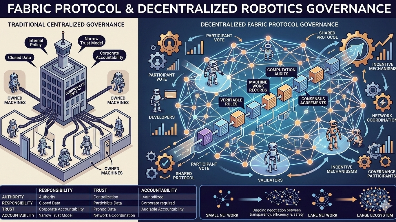 La cosa importante qui è che la governance non scompare quando diventa decentralizzata. Si sposta semplicemente in una struttura diversa. Se i robot si coordinano attraverso una rete in cui i dati, i calcoli e le regole sono registrati e verificati, allora il protocollo stesso diventa l'ambiente in cui l'autorità viene negoziata. I partecipanti contribuiscono con risorse, convalidano risultati e applicano politiche attraverso un'infrastruttura condivisa piuttosto che attraverso un controllo centralizzato.