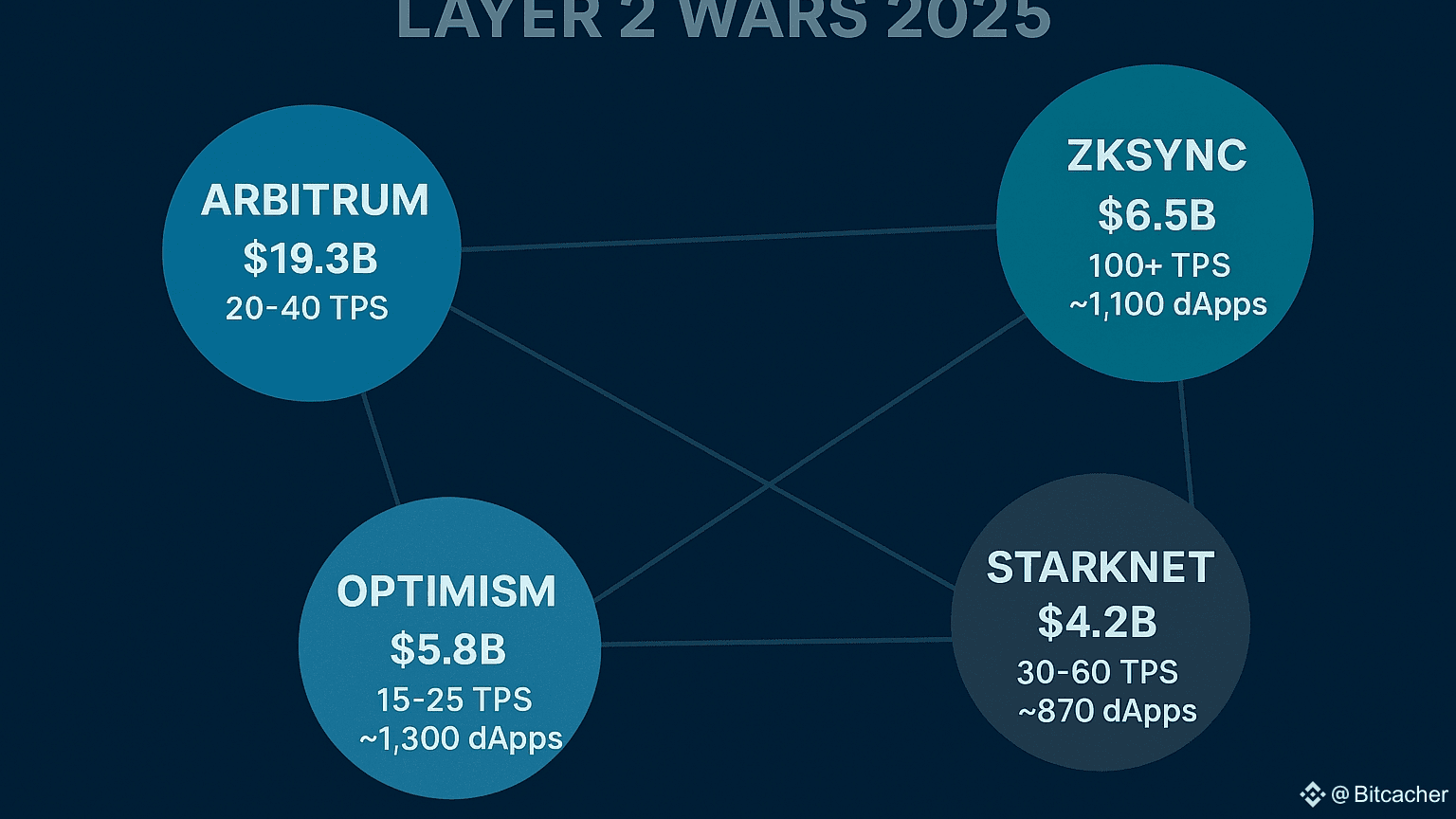 Ethereum rimane il nucleo del Web3, ma la sua scalabilità dipende dal Layer 2. Nel 2025, la competizione tra Arbitrum, Optimism, zkSync e Starknet ha raggiunto un nuovo livello — con miliardi di TVL, migliaia di dApps e l'implementazione di EIP-4844.