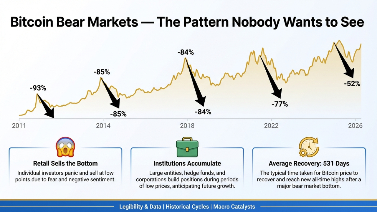 Ora siamo nel 2026 con un drawdown del 52%. Noti qualcosa? Ogni crollo diventa meno profondo. -93%, -85%, -84%, -77%, -52%. Il pavimento continua a salire perché l'infrastruttura, l'adozione e la presenza istituzionale crescono ad ogni ciclo.