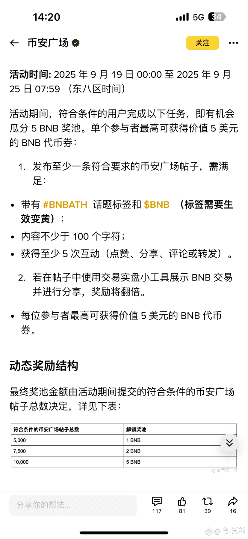 🔥L'evento BNBATH sta arrivando! Pubblica un post in piazza Binance, porta l'argomento#BNBATH 和 $BNB B B ,内容满100字符,收获点赞、评论、转发等至少5次互动,就能赢取奖励!悄悄告诉你,帖子里加上BNB交易的trade widget sharing tools,奖励直接翻倍!活动只有五六天,最高可得价值5美元的BNB代币代金券,手慢无,冲就完事!赶紧行动起来吧!