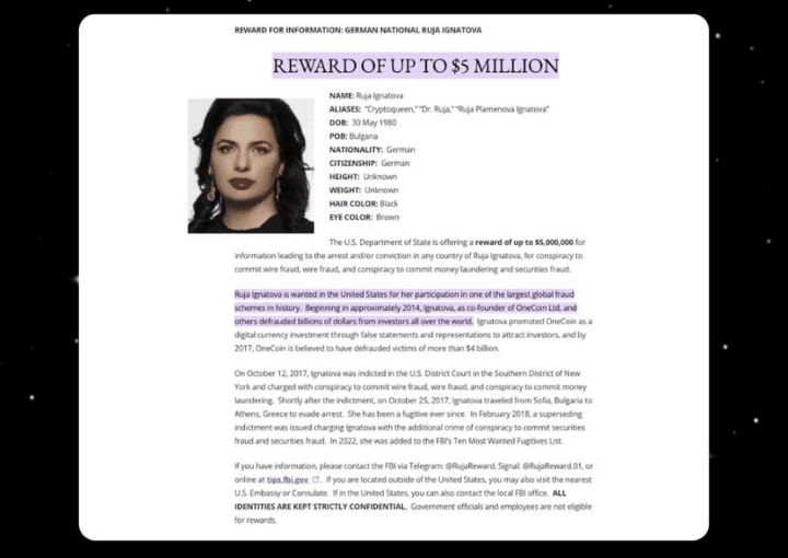 Ruja Ignatova, la "Cryptoqueen", ha rubato oltre 15 miliardi di dollari attraverso la sua falsa criptovaluta, OneCoin, prima di svanire nel 2017.