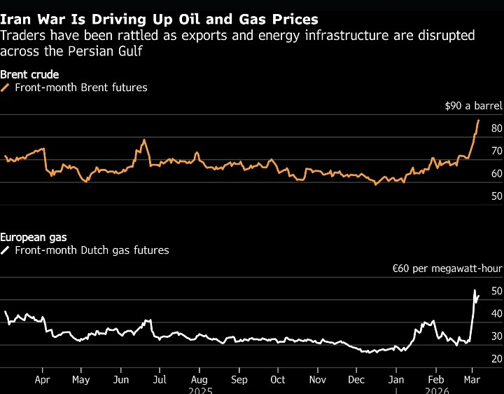 The chart above illustrates the immediate economic impact: prices for Brent Crude have surged toward $90 per barrel, while European natural gas futures have jumped dramatically, rising from roughly €30 to nearly €50 per megawatt-hour in a matter of days. Traders say the sudden volatility reflects growing fears that the conflict could disrupt critical global energy routes.