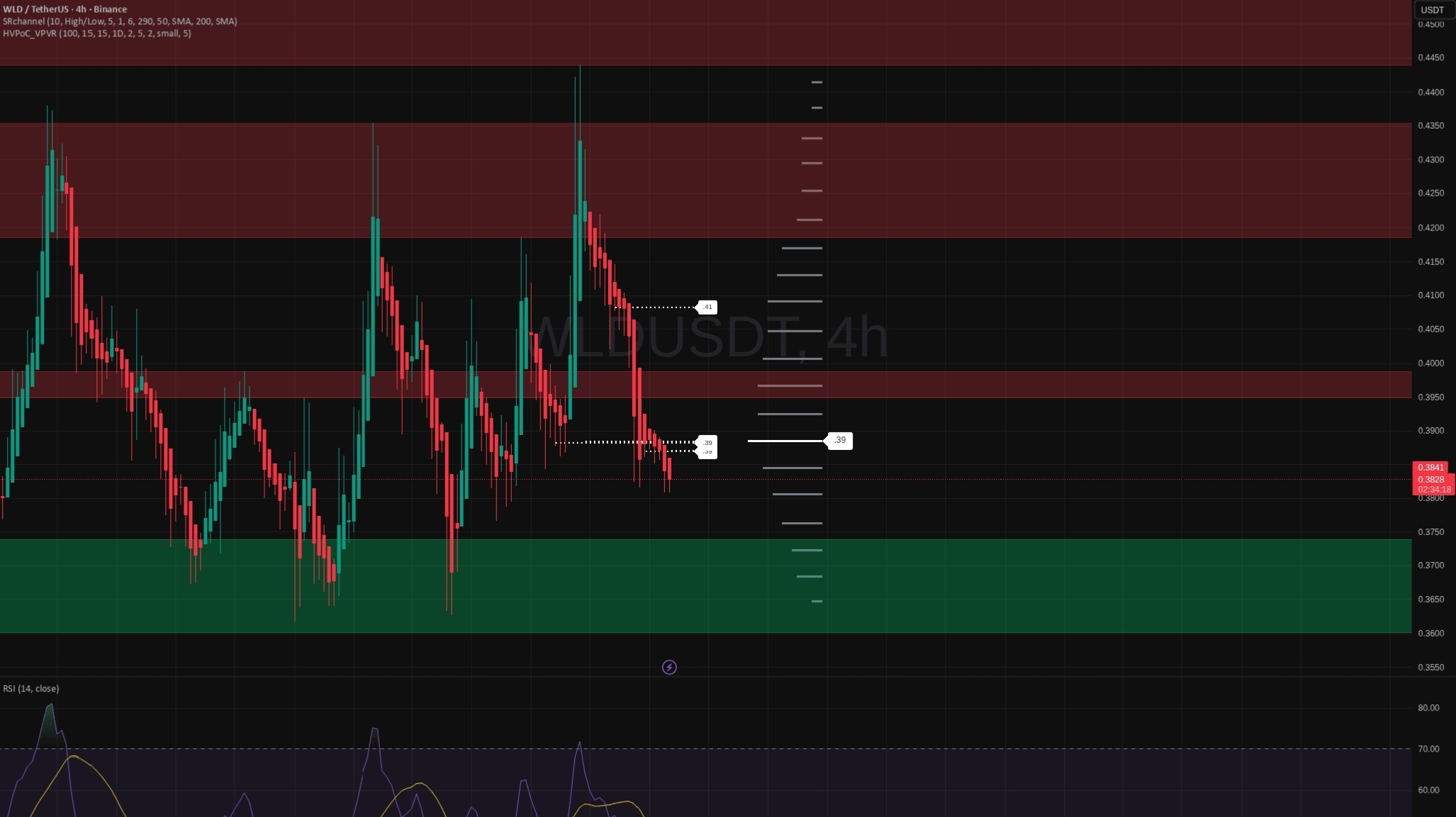 Attualmente, il prezzo sta fuoriuscendo dal range medio locale vicino a $0.39 e si sta spostando verso quel grande blocco di domanda verde sottostante.