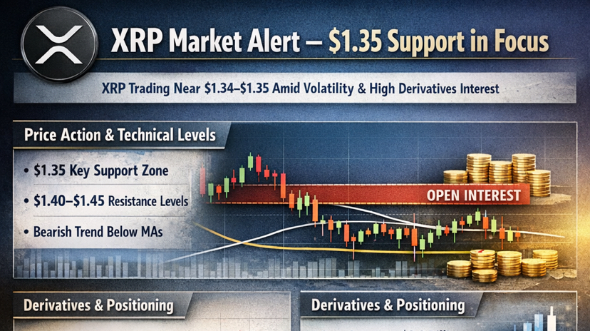 A partire dalle sessioni di trading di oggi, XRP è in prossimità di ~$1.34–$1.35, con la volatilità ancora relativamente contenuta rispetto ai precedenti movimenti di mercato. I dati attuali delle ultime 24 ore mostrano il prezzo scambiato in un intervallo ristretto, mentre il volume rimane elevato attorno al valore di diversi miliardi di dollari — segnalando una partecipazione attiva nonostante la mancanza di convinzione direzionale.