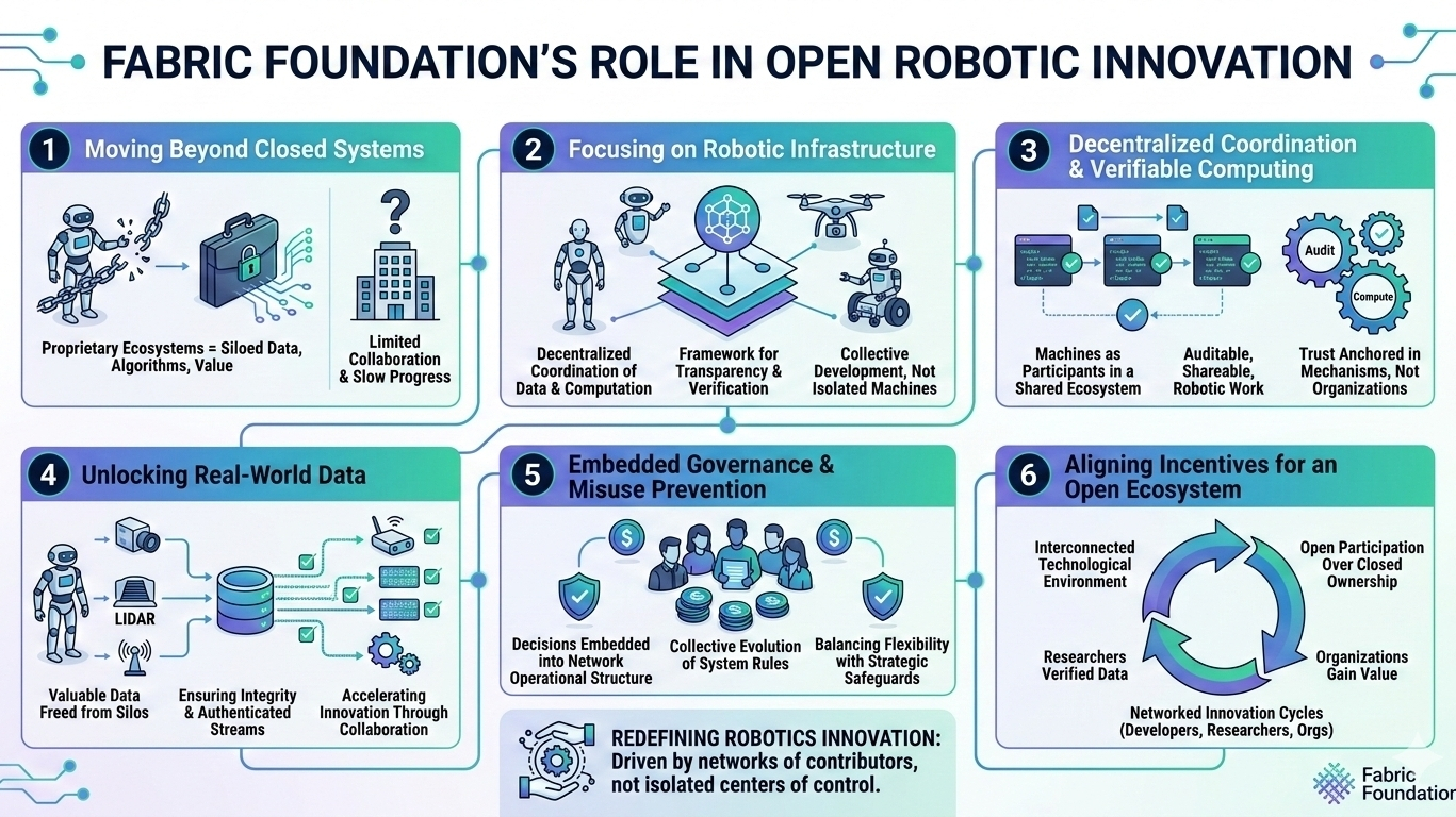 La conversazione attorno all'innovazione robotica aperta diventa quindi molto più significativa quando l'attenzione si sposta dai singoli robot ai sistemi che consentono a quei robot di coordinare il lavoro, condividere dati verificabili e evolversi attraverso la collaborazione piuttosto che l'isolamento. È qui che l'approccio infrastrutturale introdotto dalla Fabric Foundation inizia a cambiare il panorama, non costruendo un singolo tipo di robot o promuovendo un design hardware specifico, ma creando un quadro di rete in cui i sistemi robotici possono operare come partecipanti in un ecosistema tecnologico condiviso che valorizza la trasparenza, la verifica e lo sviluppo collettivo.