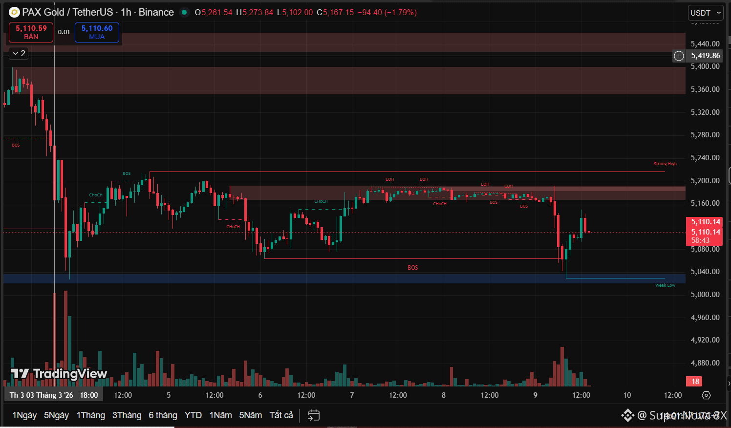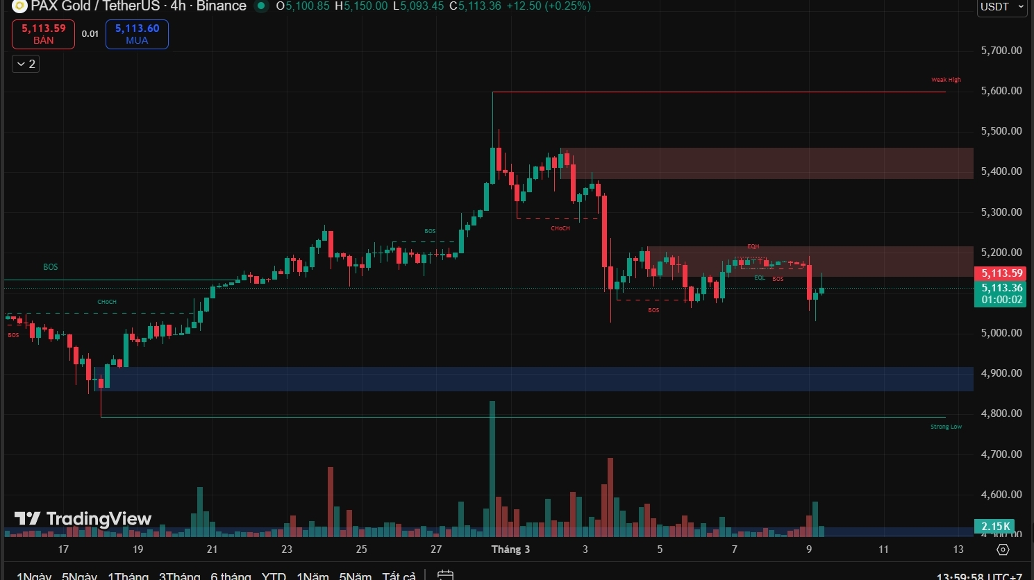 • Kháng cự: 5,200 – 5,450 (Supply HTF)
