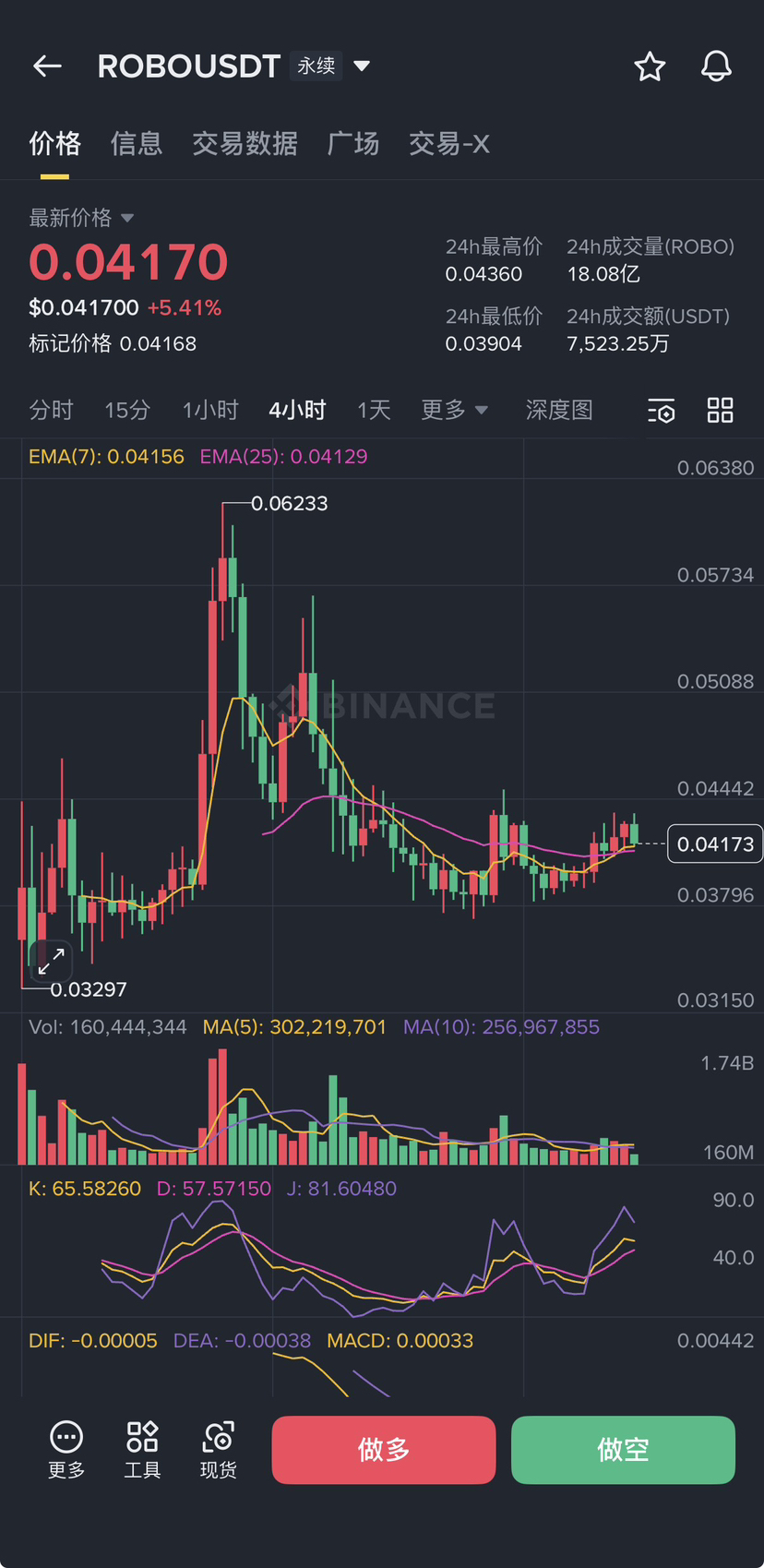 #ROBO Ho appena esaminato nuovamente il grafico a 4 ore $ROBO, la configurazione è molto più chiara rispetto all'ora. Dalla retrospettiva dei dati dello screenshot, questo aumento è partito da 0.037, con diverse candele rialziste ad alto volume che hanno toccato direttamente il massimo di 0.045, per poi entrare in un ritracciamento a volume ridotto. È fondamentale osservare la posizione attuale: il prezzo si sta consolidando intorno a 0.042, che si trova esattamente tra l'EMA15 a 4 ore (circa 0.0415) e l'EMA50 (circa 0.0405) - questa è una tipica configurazione di continuazione del trend, il sistema delle medie mobili non ha croci morte, ma solo una correzione del tasso di deviazione.