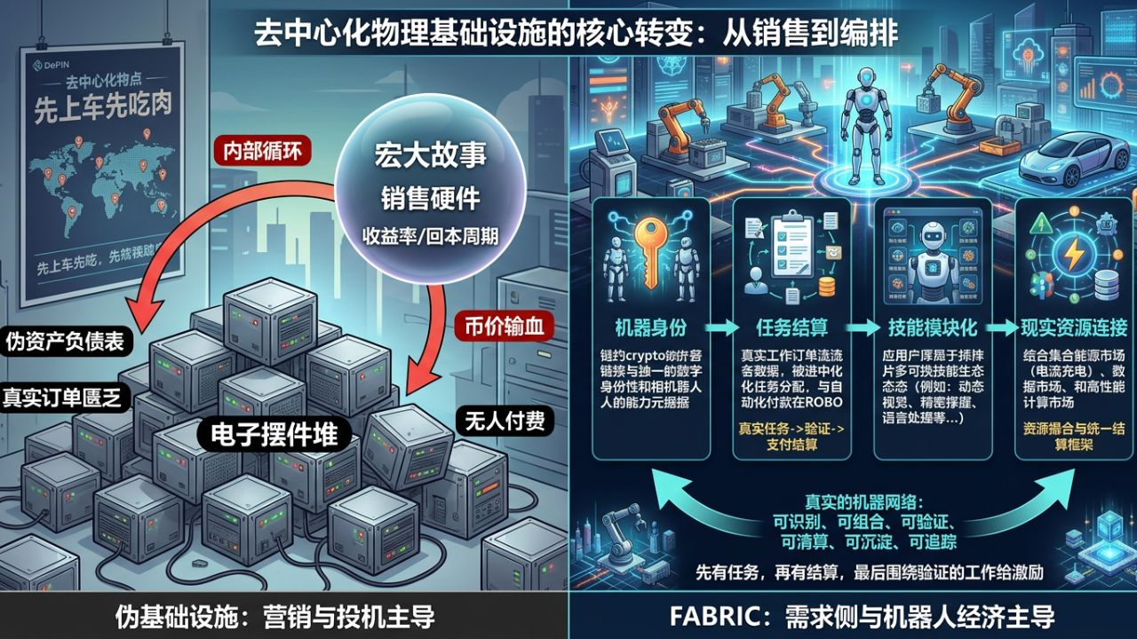 Pertanto, smettetela di raggruppare tutti i progetti relativi alle apparecchiature fisiche nel vecchio schema di "acquistare macchine e aspettare che aumentino di valore". Quell'epoca è più incline a creare frenesia, e anche più incline a creare rovina. Ciò che vale davvero la pena osservare non è quanti dispositivi qualcuno abbia pre-venduto, ma chi sta lentamente mettendo insieme i componenti fondamentali come l'identità della macchina, la definizione delle attività, i mercati delle competenze, la raccolta dati e la collaborazione tra dispositivi. Fabric, almeno nella sua documentazione pubblica, presenta un percorso più vicino a questa direzione: prima, mettere in ordine le macchine; poi, lasciare che le macchine creino valore; e infine, lasciare che quel valore sia distribuito all'interno di una rete aperta. Quanto a quanto lontano possa arrivare questo percorso, il mercato continuerà certamente a dibattere; ma almeno solleva una domanda più vicina al futuro che a "estrarre aria online" e offre una risposta più vicina alle infrastrutture che a "vendere scatole e pompare acqua".