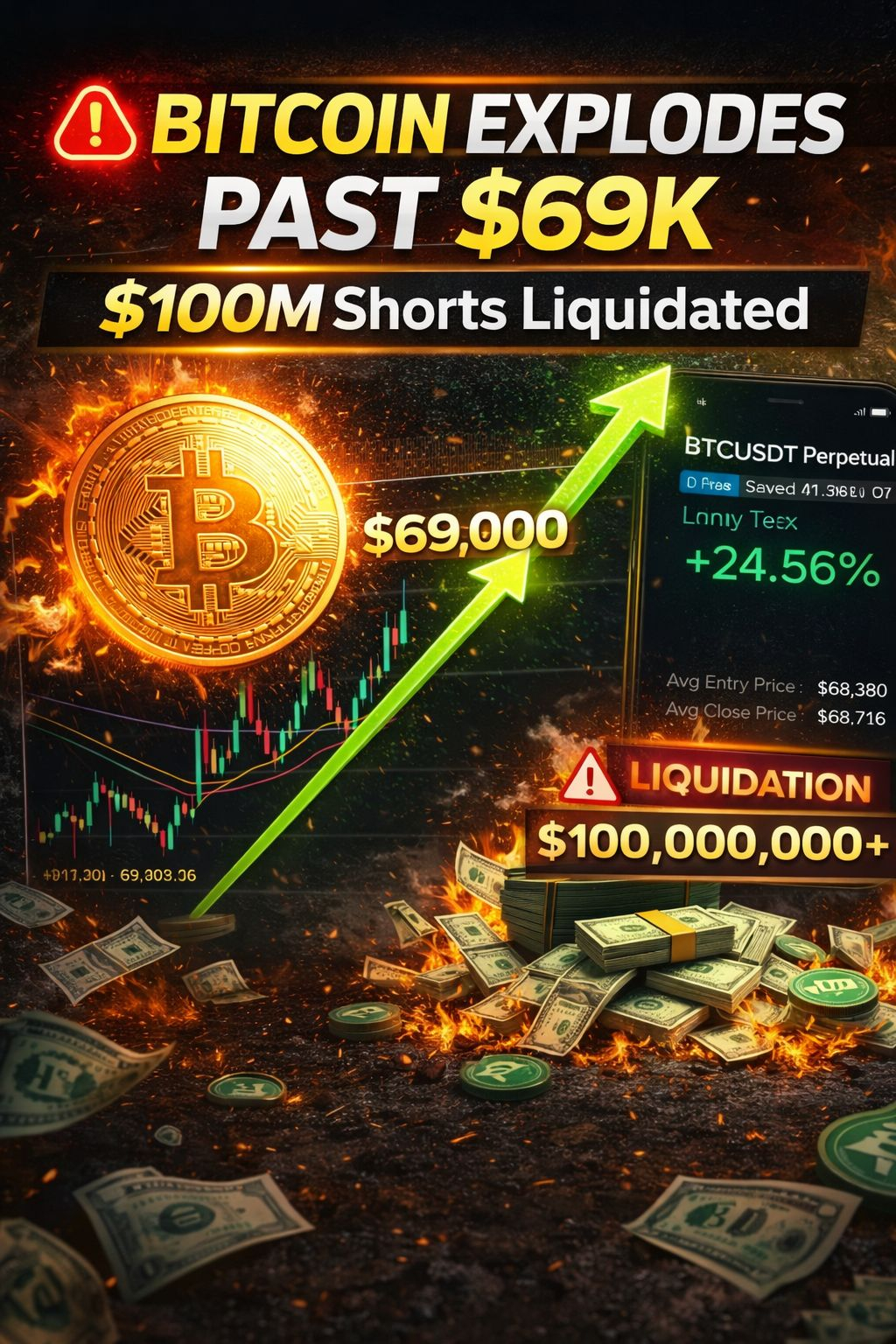The crypto market just witnessed another explosive move as Bitcoin surged past the $69,000 mark, triggering a massive wave of short liquidations. In the last few hours alone, over $100 million in short positions were wiped out, catching traders off guard who were expecting the market to dump. 🤯🔥