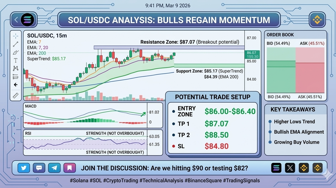 Medie Mobili (EMA): SOL sta attualmente negoziando sopra l'EMA(7) a $86.31 e l'EMA(20) a $85.96, con entrambi in tendenza al rialzo. Il prezzo è anche ben sopra l'EMA(200) a $84.39, confermando una struttura rialzista sana nel breve termine.