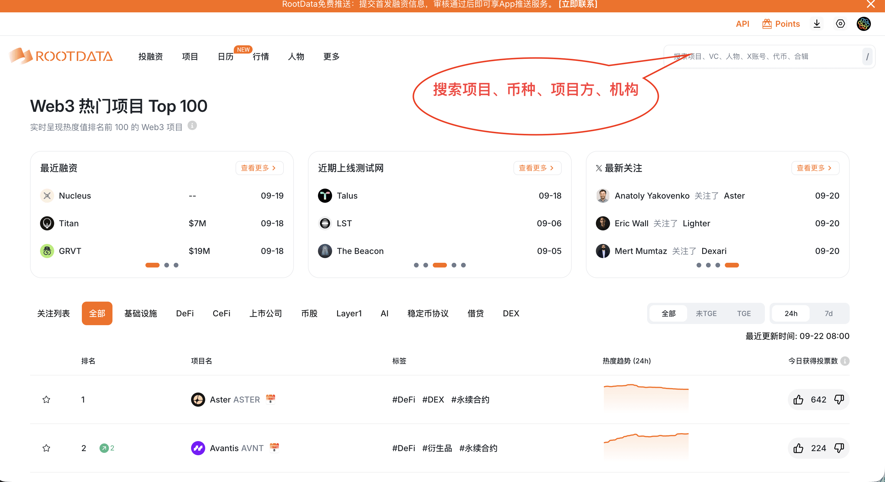 Nella parte superiore destra della homepage c'è una barra di ricerca, puoi cercare direttamente progetti, criptovalute, emittenti, istituzioni, ecc.
