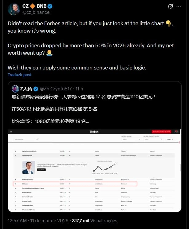 Sui social media, Changpeng Zhao ha affermato che i numeri della Forbes sono errati.#CriptoGemas