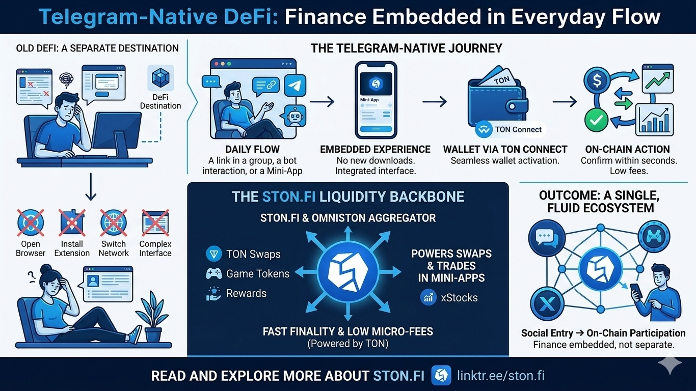 DeFi nativa su Telegram ridefinisce la domanda del prodotto da “Come facciamo a portare gli utenti in DeFi?” a “Come facciamo a far scomparire la finanza nelle interazioni quotidiane?” Questo cambia le priorità: invece di costruire destinazioni monolitiche, i team costruiscono piccoli momenti finanziari contestuali — sostenuti da liquidità profonda, basse commissioni e finalità on-chain.