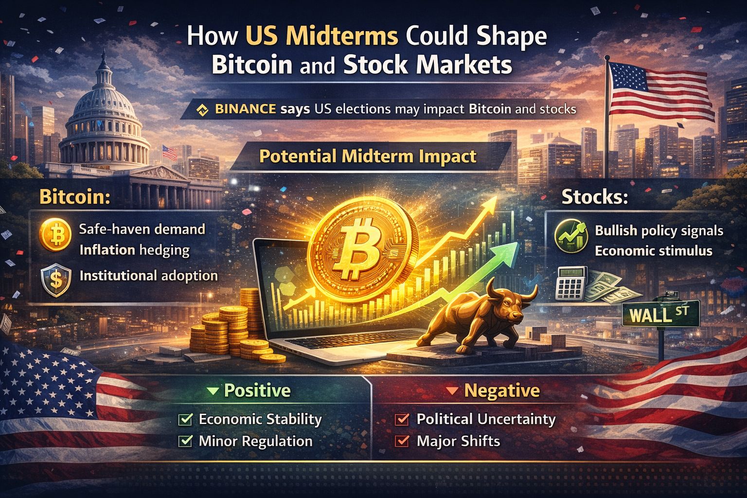 Binance, one of the world’s leading cryptocurrency exchanges, has suggested that the upcoming US midterm elections could have a notable impact on both $BTC Bitcoin and global stock markets. Political outcomes in the US often influence investor sentiment, and analysts believe the midterms could act as a catalyst for market movements.