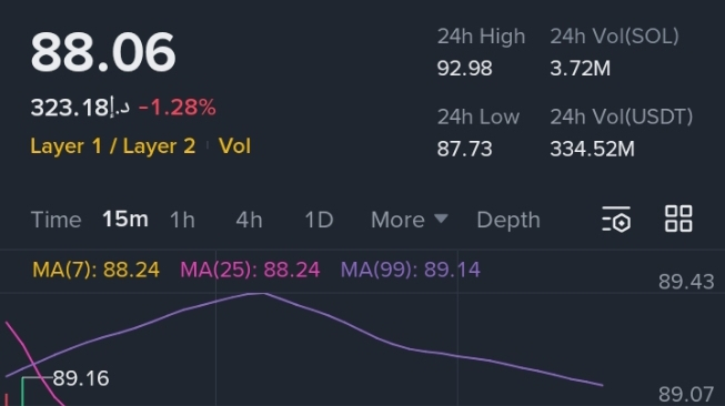 Solana sta attualmente mostrando **una debole consolidazione ribassista** nel timeframe di 15 minuti. Il prezzo è scambiato **sotto la MA(99)** e fatica a mantenersi sopra le medie mobili a breve termine, indicando un indebolimento del momentum rialzista.